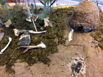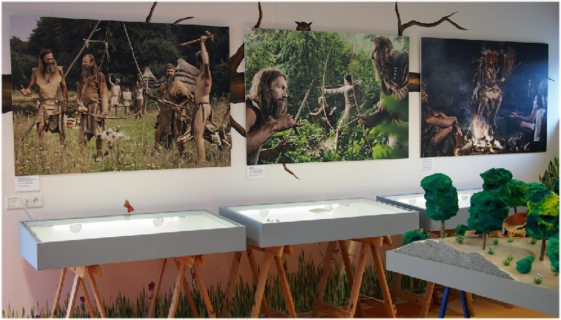 Vitrines met vuursteen, mesolithische taferelen en een deel van de maquette door de leerlingen