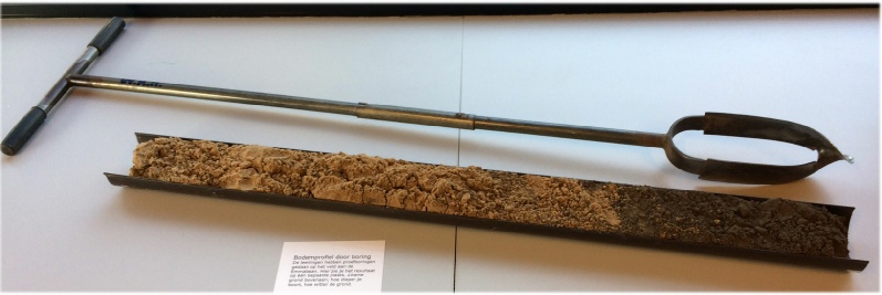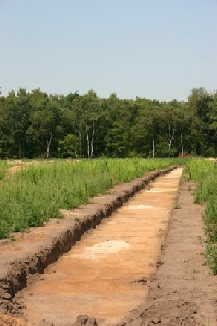 Proefsleuf, juni 2011. De lichte plekken in het midden van de sleuf geven de plaatsen aan waar geboord is.