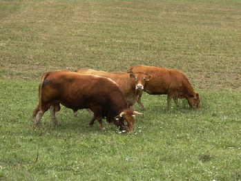 In de weilanden staan in deze streek heel mooie bruine runderen, koeien en kalfjes. Deze zie je bij ons bijna nergens. Mooi gebouwde beesten. Niet van die uitgezakte dikbillen zoals je tegenwoordig op de jaarmarkten ziet. Ook valt op wat een rommel de Fransen op het platteland bewaren. De schuren, hangars en het erf liggen vol roestig spul. Oude wasmachines, gieters, half gesloopte tractors, auto's enz. Dat gaat bij de meesten van ons naar het containerpark.