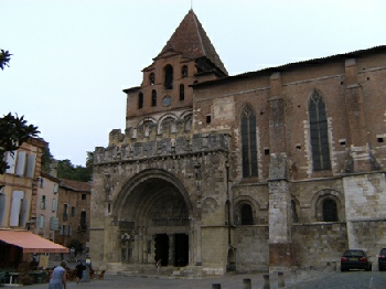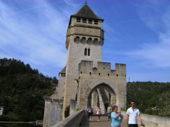 Na het ontbijt rijden we over een van de bruggen Cahors binnen. De stad is gebouwd in de binnenbocht van de rivier de Lot. Een echt puzzelwoord volgens Jo. De stad is groter dan verwacht en bruist van leven. Je kunt echt zien dat de vakanties in Frankrijk voorbij zijn; alles is weer open. In een school maken we gebruik van het computerlokaal om wat foto's voor de site door te mailen. We slenteren gezellig door de stad. Cahors is overigens bekend om z'n wijn. Een donkerrode, bijna zwarte wijn die ook wel "stierenbloed" genoemd wordt. Tegen half 12 verlaten we de stad via de Pont Valentré. Het is een van de mooiste vestingbruggen van Europa met zijn 3 torens. Een leuke legende verhaalt dat de bouwmeester in ruil voor zijn ziel de duivel te hulp riep. De bouwmeester was echter de duivel te slim af. De brug is nooit afgebouwd, want de laatste steen werd niet gemetseld. In dat gat hebben ze later een duivelsbeeldje gezet. 's Avonds stoppen we in Moissac, een mooie stad aan de Tarn. De camping ligt vlak bij het water. Maar we hoeven er niet persé met de voeten in. Het is om 20.00 uur niet meer zo warm. 's Zomers kan het hier bloedheet zijn volgens de kenners van de streek..........