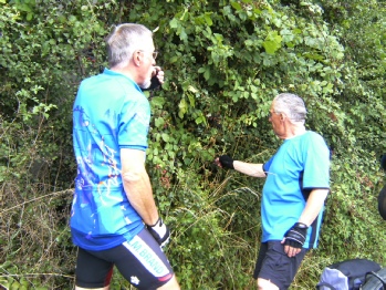 Heerlijk geslapen in een gewoon bed. Nog even kletsen bij een beker koffie en onder een strakblauwe lucht vertrekken we. De groeten aan René, de eigenaar van het refugium. Wat we zoal eten? 's Morgens zet Jo verse koffie. Daarbij brood (liefst pain du pays) met kaas, worst, jam en vanmorgen zelfs een vers eitje. Omstreeks 11.00 uur koffiekoeken (pain aux raisins ou pain au chocolat). 's Middags brood met beleg of plat du jour. Om 16.00 uur een banaan en 's avonds na 't opzetten van de tent warm eten (liefst op een terras). Tussendoor hebben we vandaag bramen gegeten. Langs de weg staan kilometers bramen en die zijn deze tijd rijp. Ondanks het zware programma vallen we niet af. Maar dat hoeft ook niet. Door 't vele klimmen gaan de koersbroeken steeds strakker om de bovenbenen zitten. Michael Bogaert kan daar jaloers op zijn.