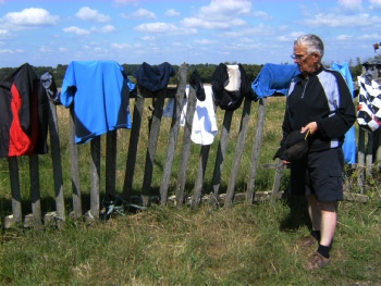 Nog mistiger dan gisteren. Dat belooft wat. De buren verwennen ons met een heerlijke beker thee. Zij hebben nl. enkele jaren geleden een gedeelte van de route gereden tot Limoges en weten dus wat pelgrims nodig hebben. Vanaf gisteren zijn we duidelijk in 't middengebergte beland. Klimmen tot boven de 500 meter, de hele dag. Maar het gaat goed. Een pastoor onderweg vraagt of we een slaapplaats nodig hebben, maar het is pas 16.00 uur en dus te vroeg. We moeten verder. In de Mairie van Grand Bourg krijgen we de 14e stempel in ons pelgrimspaspoort. Elke dag is het ons gelukt om te laten stempelen. In 't Frans heet een stempel trouwens "un tampon". In de kerk van Vezelay moesten wij dus aan een nonnetje zonder te lachen om een "tampon" vragen. We staan nu op een totaal verlaten camping. Alleen onze tent en verder niets. Zelfs de beheerder is naar huis. Lekker rustig. En het is prachtig weer. Vandaag weer tussen de 25 en 30°C.