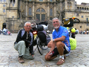 We willen proberen om vandaag Santiago te bereiken. Zeker ben je nooit. Het begint al niet zo best: Mijn koershandschoenen, sokken en Raboshirt zijn van de waslijn gestolen. Mijn onderbroek hangt er nog ondanks dat hij proper gewassen is. Als we bij onze fiets komen staat de voorband plat. We mogen niet klagen wat dat betreft. Bijna 2700 km. gereden en dat is pas de eerste lekke band. Onder het licht van een Spaanse straatlantaarn gaat de fiets op zijn kop en wordt de band geplakt. Dan gaan we er tegenaan . Steeds maar klimmen en dalen. Langzaam komt Santiago dichterbij. In de straten van de stad is het vrij steil. Eindelijk rijden we het plein voor de enorme kathedraal op.
