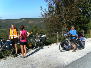 Het is mistig en koud vanmorgen. We ontbijten in het "Cafeteria" naast de albergue. Dat is speciaal open voor de pelgrims. Iedereen probeert zijn graantje mee te pikken van de jaarlijks honderdduizenden passanten. We doen ons regenjack aan tegen de nattigheid en rijden met licht op het dorp uit. Het is al over elven als de zon doorbreekt. Jas uit, vest uit, lange broek uit; het is weer hoogzomer. Onderweg praten we nog even met de Duitsers die we enkele dagen geleden ook al ontmoet hebben. Een half uur later worden we ingehaald door een jong koppel uit Oost-