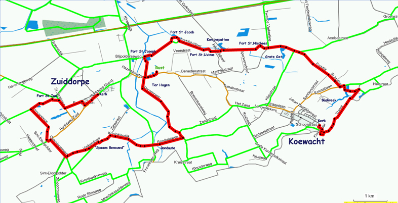De route liep via St. Andries richting het Grote Gat. Vanaf fort St Nicolaas volgde men de Staats Spaanse linies tot fort St Jozef. Via de Uilendreef wandelde men richting rustpunt met koffie en thee bij de familie Rozijn op zorgboerderij “De Bonte Koe”.