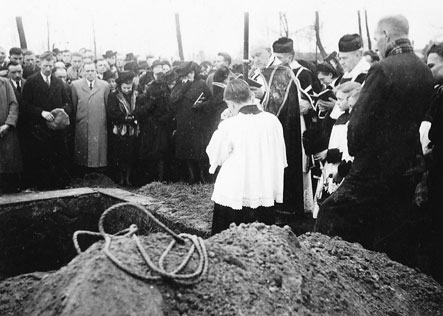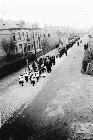 We zien op de dag van de begrafenis een enorme stoet door de Nieuwstraat trekken richting kerk. Voorop de misdienaars gevolgd door drie priesters. Het was dus een "mis met drie heren". Dit gebeurt in de Katholieke kerk alleen bij heel speciale gelegenheden.