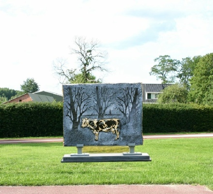 Vervolgens was de beurt aan Ton Koops. Hij maakt voornamelijk beelden van roestvrij staal. Ook dit ontwerp was in RVS uitgevoerd. Een bewerkte koe met drie bomen als windvanen. Dat wil zeggen dat de kruinen ervan door de wind steeds in een andere richting kunnen worden gezet. Het beeld “beweegt” dus.