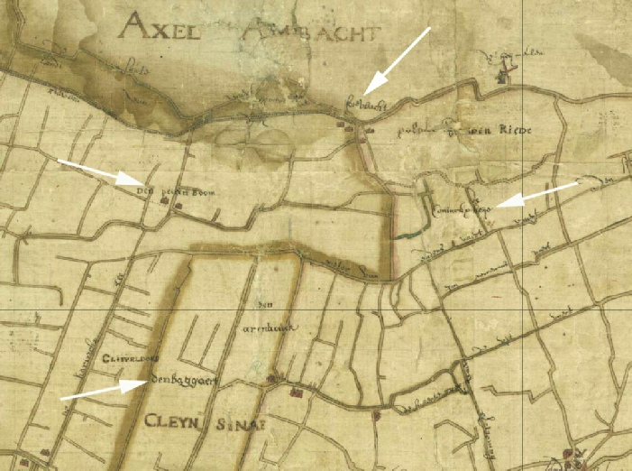 1586 Prins Maurits neemt Axel in. Hij steekt de dijken door ter bescherming. Hierdoor lopen de laaggelegen polders onder en ontstaat er een breed water ten noorden van Koewacht en Zuiddorpe. Axel, Terneuzen en Biervliet komen op een eiland te liggen.